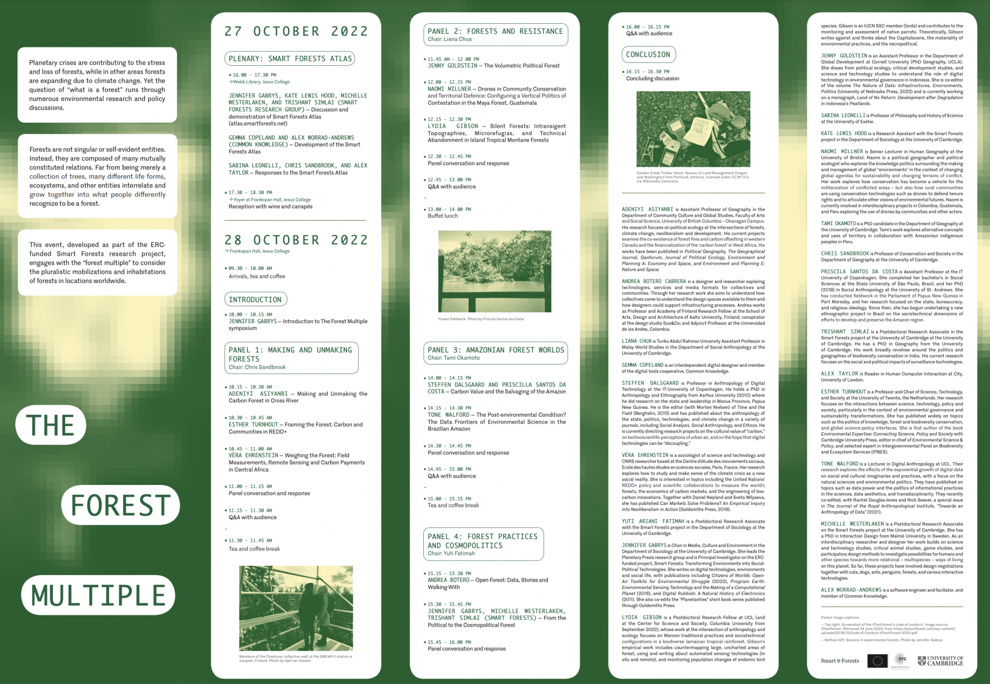 Adeniyi Asiyanbi, Andrea Botero, Steffen Dalsgaard, Véra Ehrenstein, Lydia Gibson, Jenny Goldstein, Naomi R Millner, Priscila Santos da Costa, Esther Turnhout, Tone Walford, Common Knowledge, and the Smart Forests research group (Jennifer Gabrys, Kate Lewis Hood, Trishant Simlai, Michelle Westerlaken, and Yuti Ariani Fatimah), with responses and chairing from Chris Sandbrook, Sabina Leonelli, Alex Taylor, Liana Chua, and Tami Okamoto.